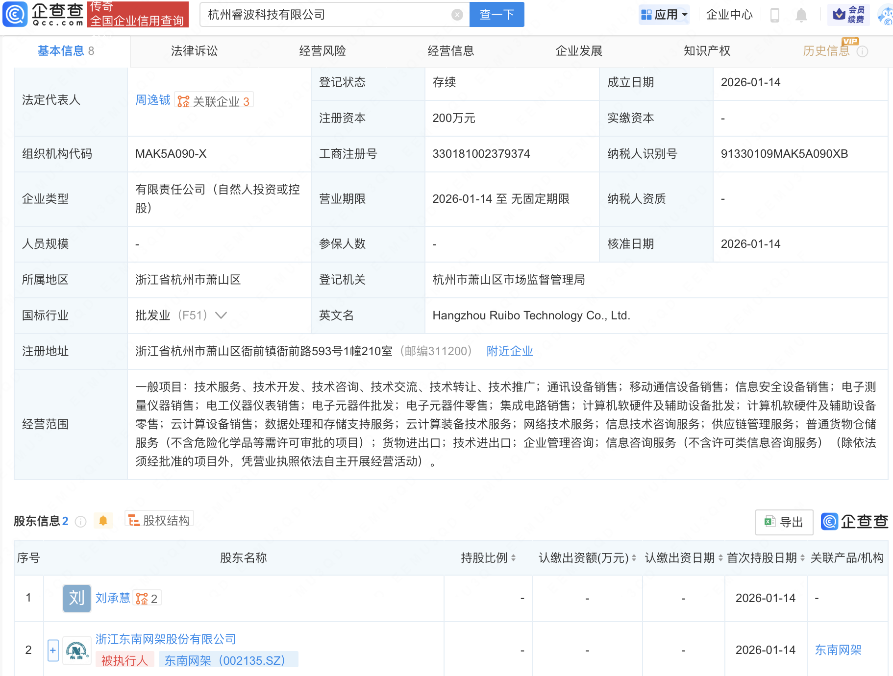近日,杭州睿波科技有限公司成立,经营范围包含:移动通信设备销售;信息安全设备销售;电子元器件零售;集成电路销售等。企查查股权穿透显示,该公司由东南网架(002135)等共同持股。